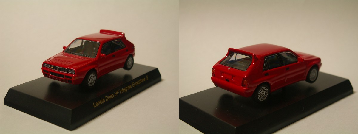 マセラティのクアトロポルテの色違いかランチアデルタのマルティーニ仕様(モンテカルロしようにするならライトポッドもついて欲しかった)、アストンマーティンのヴァンキッシュもよかったのですが、結局選んだのがサークルKサンクス限定京商ランチアデルタのHFインテグラーレ・エヴォルツィオーネⅡの赤色です。